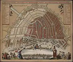 A construção avançou de oeste para leste, em toda a largura do layout, como um limpador de para-brisa gigantesco, como o historiador Geert Mak o chama - não do centro para fora como diz um mito popular.[11] A construção do setor noroeste foi iniciada em 1613 e concluída por volta de 1625. Após 1664, a construção no setor sul foi iniciada, embora lentamente devido ao clima econômico. A parte oriental do plano concêntrico do canal, cobrindo a área entre o rio Amstel e a Baía de IJ, não foi implementada por um longo tempo. Nos séculos seguintes, o terreno foi destinado principalmente para parque, jardim botânico, lares para idosos, teatros e outras instalações públicas, e também para hidrovias.[11]