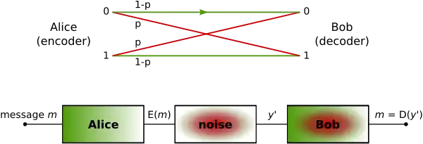 Um canal binário simétrico com probabilidade de erro é um canal com entrada binária, saída binária e probabilidade de erro . Portando, se X é a variável aleatória transmitida e Y é a variável recebida, então o canal é caracterizado pelas seguintes probabilidades condicionais: