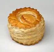 Um vol-au-vent ( pronúncia em francês: [vɔlovɑ̃] , "soprado pelo vento") é um canapé pequeno, redondo feito de massa folhada.