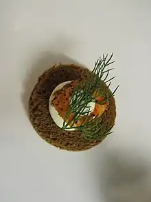 A composição técnica de um canapé consiste em uma base (por exemplo, pão ou panqueca), uma pasta, um item principal e um enfeite . A propagação é tradicionalmente uma manteiga composta ou um creme de queijo sabor. As guarnições comuns podem variar de vegetais picados, cebolinha e ervas a caviar ou óleo de trufa.