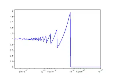 Pelo critério de Leibniz[5] aplicado à série de taylor de f(x) dentro do intervalo -10-7≤ x ≤ 10-7, o valor de f(x) poderia ser aproximado por 0.5 com quatorze dígitos significativos. No entanto, o gráfico do resultado obtido usando uma precisão Double IEEE 754 é: