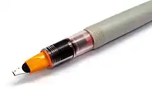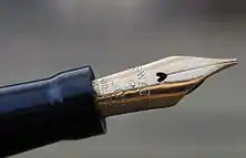 A ponta inteira se estreita até o local em que a tinta é transferida para o papel. Canetas de caligrafia larga podem ter várias fendas na ponta para aumentar o fluxo de tinta e ajudar a distribuí-la uniformemente pela ponta larga. Pontas divididas em forma de três "dentes" são comumente usadas para escrever partituras musicais.[71]