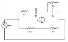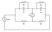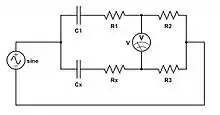 Quando balanceado, as relações para capacitância e resistência desconhecidas deste circuito são