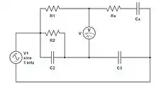 As relações que determinam a capacitância e resistência desconhecidas para este circuito são, quando o circuito estiver balanceado (V=0),