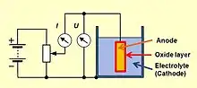 Para aumentar a sua capacitância por unidade de volume, todos os materiais anódicos são gravados ou sinterizados e têm uma estrutura de superfície rugosa com uma área superficial muito maior em comparação com uma superfície lisa da mesma área ou com o mesmo volume. Ao aplicar uma voltagem positiva ao material anódico acima mencionado num banho eletrolítico, será formada uma camada de barreira de óxido com uma espessura correspondente à voltagem aplicada (formação). Esta camada de óxido atua como dielétrico em um capacitor eletrolítico. As propriedades dessas camadas de óxidos são dadas na tabela a seguir: