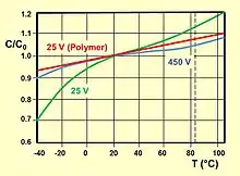 Cada capacitor eletrolítico forma, em princípio, um "capacitor de placa" cuja capacitância se torna maior com a área de eletrodo, maior permissividade ε, e espessura do dielétrico (d).