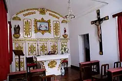 O altar-mor tem um fundo branco com bonitos trabalhos em talha dourada.