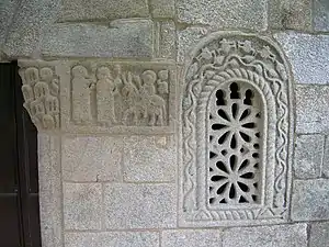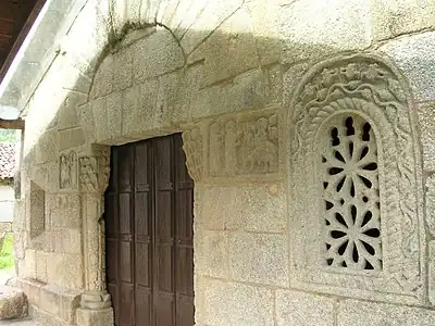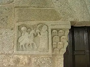 A decoração dos capitéis prolonga-se em relevos gravados diretamente no perpianho semelhantes aos de San Xoan de Camba (Castro Caldelas). Em ambos os lados aparecem representados uma personagem aureolada montada num asno que leva na mão um possível ramo e figuras com túnicas saindo ao passo (duas no da direita e uma no da esquerda). São de talha muito plana com o fundo rebaixado e enquadram-se por um ressalto reto e ajustado as figuras em pé. Sobre a interpretação desta representação existem várias teorias que coincidem em assinalar que se trata de cenas bíblicas: