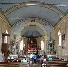 O interior tem uma nave única e uma capela-mor ao fundo. Nota aqui o predomínio do estilo neogótico, que entre fins do século XIX e início do século XX foi o favorito dos imigrantes italianos da região. A entrada se faz sob um coro de madeira sustentado por duas delgadas colunas de corte octogonal, e decorado com singelas pinturas (Santa Cecília, o rei David com o saltério, e um outro santo não identificado) inseridas em três medalhões ao longo do parapeito. Ainda debaixo do coro ficam dois confessionários em madeira, um de cada lado da entrada.