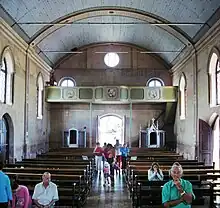 Ao longo da nave se abrem janelas em ogiva com colunetas laterais e um relevo foliáceo acima. Nas paredes há decoração ornamental em pintura executada por Antônio Cremonese, com guirlandas em trompe-l'oeil na parte superior, e efeitos marmorizados nas pilastras e rodapés. Atualmente as paredes estão nuas por força do restauro, mas antigamente encontravam-se apinhadas de ex-votos, e por isso o nome popular deste templo. O teto, em abóbada de berço de arco abatido, é todo de madeira em tom azul claro, pontilhado de diminutas estrelas douradas, e descansa sobre uma larga cornija decorada por um friso em motivo floral. Na metade da nave se abre uma porta de cada lado, e logo em seguida à da esquerda está um púlpito simples, em madeira, com dossel. As bancadas são também de madeira com discreto trabalho de talha, e o piso é decorado com ladrilhos em variados motivos geométricos.