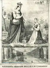Na escolha do patrono a comunidade se dividiu. Uns preferiam consagrar a capela a Nossa Senhora de Loreto, outros, a santo Antônio de Pádua. A imagem venerada era uma gravura da Santa trazida da Itália em 1876 por Natal Faoro e emprestada por ele à comunidade, até que houvesse uma imagem mais digna.[1] Em 1885 foi adquirida uma estátua da Virgem de Caravaggio do escultor italiano, radicado em Caxias do Sul, Pietro Stangherlin, criada a partir do modelo que se via na gravura antes venerada, sendo trazida a pé em procissão desde a outra cidade, a cerca de 15 km, e entronizada na capela. Desde então se formou uma tradição de romarias e peregrinações à igrejinha, que se perpetua até hoje.