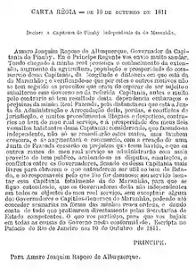 O Governo da Capitania do Piauí permaneceu administrativamente subordinado ao da Capitania-Geral do Maranhão até 30 de maio de 1811, quando Carta Patente do então Príncipe Regente Dom João nomeou o sr. Amaro Joaquim Raposo de Albuquerque Governador da Capitania do Piauí, «que sou servido desmembrar da Capitania-Geral do Maranhão para ficar inteiramente a sua administração independente desta a que era subalterna».[carece de fontes]