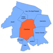 ![]() Do topo, em sentido horário: Pórtico de Entrada do Município RN 117; Igreja Matriz de São Sebastião (Caraúbas); vista panorâmica da praça Reinaldo Pimenta; Avenida Jório Fernandes, praça João Bosco Benevides (Pracinha do Coração) | |||