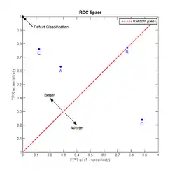 A diagonal anteriormente referida, divide o espaço ROC. Pontos acima da diagonal representam bons resultados de classificação (pelo menos melhor que o aleatório); pontos abaixo da diagonal representam maus resultados (pior que o aleatório). Note-se que a saída de um preditor consistentemente ruim poderia simplesmente ser invertida para obter um bom preditor.