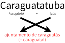 Caraguatatuba é vocábulo tupi, que segundo Silveira Bueno significa "lugar de muitos caraguatás", ou seja, "caraguatal", "caraguatazal". Do tupi karagûatá: designação comum dada a várias espécies de plantas epífitas e terrestres da família das bromeliáceas, também conhecidas como gravatá, e tyba: abundância, grande quantidade, ajuntamento, termos que juntos formam uma relação genitiva, dando significado ao nome no município.[10]