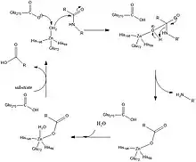 O zinco metálico se comporta como um ácido de Lewis que por sua vez estabiliza uma molécula de água que está coordenada a ele e é um dos principais responsáveis por estabilizar os intermediários negativos durante o prosseguimento da reação. O processo de estabilização da molécula de água ocorre por resíduos polares que estão próximo ao sítio ativo que ajudam a estabilizar uma ligação de hidrogênio. [5]
