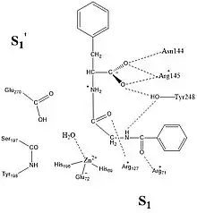 O sitio ativo da enzima conhecido como S1 e S1' (Fig.1) é o locus da catalise. O S1' é um local essencialmente hidrofóbico e possui um grupo Tyr-248 como uma “capa” para esse local um vez que o substrato for ligado esse local é um dos principais responsáveis pela preferência de cadeias aromáticas e alifáticas[5][3]. Uma interação que foi relatada de grande importância para a catálise consiste na interação do grupo Arg- 127 que interagem em conjunto com o ácido carboxílico terminal e o oxigênio da cadeia peptídica que está coordenada ao zinco.[3]