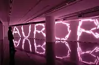 “A palavra AURORA foi inscrita na parede com lâmpadas tubulares que emitiam uma luz de tonalidade rosa-violeta. Pela extensão do conjunto e o grande número de lâmpadas, todo o ambiente ficava intensamente tingido de uma luz rosácea. Lembrava a claridade da manhã. Mas não se tratava de representar uma luminosidade. AURORA foi inscrito na parede também como assimilação da forma dos grafites de rua, daqueles que são feitos nos muros da cidade grande. Aurora é nome de mulher e é também nome de rua. Aurora, como alguém lembrou, também é o nome do navio que fez história na Rússia em 1917. Aurora é ária de ópera e já fez sucesso como marchinha carnavalesca.”[14][15] |