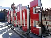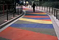 Intervenção arquitetônica permanente na fachada e nos arredores do edifício da Escola René Binet, Paris, França "A escolha do mesmo conjunto de cores para a fachada e o pavimento buscava enfatizar a unidade do projeto, combinando o plano horizontal do caminhar, ativo e vivencial, e o plano vertical, visível a distância, fazendo da escola um signo coletivo, um marco de referência para os habitantes do bairro."[15] No inverno de 2015, o trabalho foi demolido junto com partes do edifício para uma remodelação ampla de todo o conjunto escolar. |