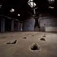 Intervenção no espaço do antigo Matadouro Municipal de São Paulo, Projeto Arte-Cidade I, Secretaria de Cultura do Estado. A intervenção era constituída por 48 buracos, distribuídos regularmente no chão de um dos galpões, em uma área de aproximadamente 350m2. Os buracos tinham bordas irregulares, mas formatos e profundidades semelhantes. O arranjo dos buracos no chão, somado à baixa luminosidade do ambiente e às paredes em ruínas do edifício reverberavam o sentido de A Cidade Sem Janelas, título da exposição. |