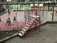 Intervenção realizada no Museu da Cidade - Chácara Lane, em São Paulo, por ocasião da exposição retrospectiva Carmela Gross: Arte à Mão Armada, entre setembro de 2016 a abril de 2017. Trata-se de uma escada metálica de dois lances, que funciona como traço de união entre o Museu e a Escola Gabriel Prestes, espaços vizinhos, mas habitualmente separadas por uma grade alta. Os dois lances, com nove degraus de cada lado, permitem o ir e vir das crianças e oferecem uma integração dos dois espaços. Para além da real ligação espacial, a escada se oferece para recompor a relação entre arte e educação. |
