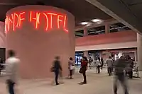 Luminoso de 3 metros de altura e 15 metros de comprimento, feito de lâmpadas fluorescentes tubulares e estrutura metálica, instalado na parte externa, no alto do edifício da Bienal, por ocasião da XXV Bienal Internacional de São Paulo[12]. As estrias luminosas das lâmpadas formavam a palavra HOTEL, um grande anúncio luminoso que podia ser visto de longe e que assinalava, em vermelho, um espaço de relações transitórias, provisórias. |