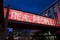 Esse trabalho foi concebido para ser construído em duas passarelas de pedestres, em ruas diferentes da cidade de Christchurch, na Nova Zelândia, por ocasião da exposição SCAPE 2008 Christchurch Biennial of Art in Public Space. Uma conteria a frase REAL PEOPLE e a outra, ARE DANGEROUS, ambas construídas com tubos de luz fluorescente vermelha. A descontinuidade espacial entre as duas partes da frase buscava abrir o sentido e suscitar múltiplas leituras. Por outro lado, quando lidas juntas e reunidas numa afirmação, a junção passava a refletir a retórica do medo que domina e controla muitos aspectos da vida contemporânea. Na época da Bienal em Christchurch, a segunda parte da frase “ARE DANGEROUS” foi interditada pelas autoridades locais. O trabalho só foi montado integralmente em 2019, na exposição Roda Gigante, no átrio do Farol Santander em Porto Alegre, Rio Grande do Sul. |