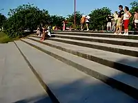 Porto Alegre, Rio Grande do Sul, Brasil. "Conjunto de 16 lajes superpostas, apoiadas no talude da margem do rio Guaíba, em Porto Alegre. Os degraus têm formas semelhantes, mas suas medidas são variáveis. Sua disposição cria um movimento rítmico irregular que, ao se desenvolver, ora se distende, ora se contrai. O conjunto cria uma praça-anfiteatro, de costas para a avenida e de frente para o rio. Reorienta a cidade para o rio."[15] |
