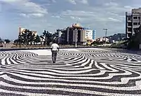 Laguna, Santa Catarina, Brasil. "FRONTEIRA, FONTE, FOZ é o nome do trabalho para uma praça na cidade de Laguna, em Santa Catarina, realizado como parte do Projeto Fronteiras, organizado pelo Itaú Cultural. Sua forma triangular e alongada tem uma área aproximada de 1.600 m², toda pavimentada por pedras brancas e pretas. O mosaico português foi disposto segundo as linhas sinuosas de um desenho repetitivo que esboça uma figura. A justaposição das pedras, segundo o modo sistemático dos mosaicos, reconstitui o trabalho repetitivo que está na origem das marcas primordiais feitas pelo homem. Por sua vez, a ideia de praça como espaço aberto na cidade servirá sempre ao encontro, à passagem, à festa, à comemoração, ao protesto."[15] |