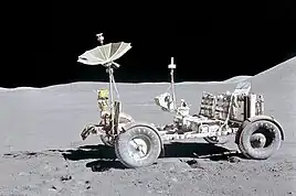 O primeiro automóvel ("astromóvel") a circular fora do planeta Terra, o Lunokhod 1, não-tripulado e controlado remotamente a partir de sua base terrestre, era alimentado pela energia elétrica fornecida por poinéis solares.[16][17] LRV (Lunar Roving Vehicle) um carro elétrico de quatro motores (um para cada roda e alimentados por baterias não-recarregáveis) usado na Lua pela tripulação da Apollo 15 em 31 de Julho de 1971, foi primeiro astromóvel tripulado a circular fora da Terra.[7]