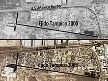 O conflito do governo mexicano com o antigo Ejido Tampico data de 1970, quando eles expropriaram 320 hectares (790 acres) do Ejido Tampico para construir uma nova pista e terminal de passageiros no aeroporto de Tijuana e concordaram em pagar aos deslocados ejidatarios (os agricultores comunais) 1,4 milhões de pesos (112.000 dólares em 1970). Quando o governo mexicano falhou em indenizar os ejidatários por suas terras agrícolas perdidas, eles reocuparam uma área de 79 hectares (200 acres) do aeroporto de Tijuana e ameaçaram um conflito armado. De 1970 a 2000, as terras ocupadas no aeroporto de Tijuana permaneceram relativamente subdesenvolvidas. Em 1999, o aeroporto de Tijuana foi privatizado e passou a fazer parte de uma rede de 12 aeroportos conhecida como Grupo Aeroportuario del Pacífico. Em uma tentativa de resolver a disputa e remover os ejidatários do aeroporto privatizado de Tijuana, o governo mexicano estabeleceu um valor nos 320 hectares expropriados (790 acres) em 1,2 milhão de pesos (125.560 dólares em 1999), enquanto os ejidatários do antigo Ejida Tampico, levando em conta o aumento no valor das propriedades de 1970 a 1999 e a privatização do aeroporto de Tijuana, estabeleceram um valor comercial em suas terras perdidas em 2,8 bilhões de pesos (294 milhões de dólares). Em 2002, o presidente mexicano Vicente Fox, que havia prometido resolver o problema, também falhou.[135] Os ejidatários passaram a desenvolver comercialmente a área de 79 hectares (200 acres) no aeroporto de Tijuana, arrendando prédios e lotes para empresas de transporte e armazenamento. Em 2006 o desenvolvimento não permitido permitiu a construção de um "super túnel" de drogas de 2.400 pés (730 metros) originário do antigo Ejido Tampico e adjacente à pista do aeroporto de Tijuana.[136] Como túneis de drogas anteriores, cruzou a fronteira dos EUA com o México até um depósito em Otay Mesa, em San Diego, com capacidade para transportar cargas de várias toneladas de narcóticos.[137][138]