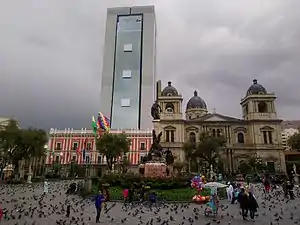 A proposta para a torre foi inicialmente recusada devido as restrições municipais de altura do distrito histórico, com o escritório prefeitural de Paz declarando que os Padrões de Uso de Terra e Estabelecimento proibiam tais edifícios, com o representante Luis Lugones declarando que "Se o governo quiser construir um palácio entre 10 ou 12 andares, acabará sendo proibido".[3] Aliados do Presidente Evo Morales na Assembleia Legislativa Plurinacional da Bolívia ajudaram na circundação da lei, permitindo a construção da torre.[4][5]