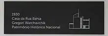 Entrada da Casa Modernista da Rua Bahia, com o número, a placa de "Patrimônio Histórico Nacional" e a placa do escritório de design (FutureBrand) que funciona atualmente no local