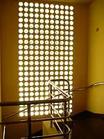 Os caixilhos originais em ferro foram substituídos por madeira e o caixilho com basculantes na escada foi substituído por blocos de vidro cilíndricos.