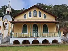 O acesso à edificação se faz por uma varanda em estrutura de madeira e telhas cerâmicas. Segundo dados históricos da SeCult-ES, a edificação foi construída pela família Reisen para uso residencial e, nos anos 1970, a cúria metropolitana de Vitória a adquiriu para uso como casa paroquial[2].
