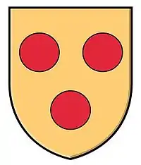 | Brasão não diferenciado da Casa de Courtenay ("Or, três roundels"). Aparentemente adotado por Reinaldo de Courtenay antes de sua morte em 1190 e antes da divisão da família nos ramos inglês e francês, pois o brasão é utilizado nos dois países. Trata-se, portanto, de um brasão muito antigo, pois a heráldica só se tornou amplamente utilizada entre 1200 e 1215. | |||