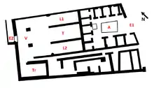 Os recintos ao sul do pátio (o chamado triclínio), onde chegava o corredor que provavelmente levava ao acesso original, estava todo decorado com pinturas, entre as quais se destacava no centro da parede de frente para a entrada uma paisagem com a deusa Diana.