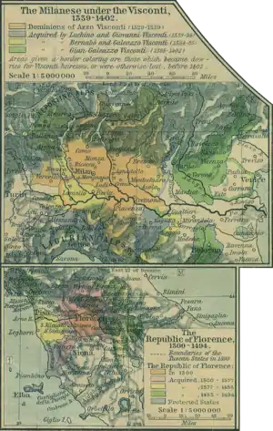 Os Visconti possuíam o título de "senhores" e, em seguida, a partir de 1395, na pessoa de João Galeácio, o de "duques de Milão". Com a morte do último duque, Filipe Maria, em 1447, a República Ambrosiana foi criada na cidade por um período de menos de três anos. No entanto, a sucessão dos Visconti em Milão, perpetuou-se na pessoa de Bianca Maria Visconti, filha de Filipe Maria Visconti, que se casou com Francisco I Sforza, il condottieri, que assumiu o ducado a partir de 1450.