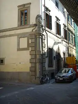 O duplo brasão deve-se à aquisição do edifício, em 1577, por parte do pintor Federico Zuccari, que o usou como habitação durante a sua permanência em Floença para afrescar a cúpula de Santa Maria del Fiore, antes iniciada por Giorgio Vasari. Depois de ter herdado a oficina do irmão Taddeo, Zuccari era um dos pintores mais em voga naquele período e recebia encomendas de toda a Europa; consciente do confronto com a herança dos grandes mestres florentinos, quis provavelmente promover a sua imagem quando mandou iniciar os trabalhos para construir contiguamente, além do jardim interno e da fachada na actual Via Giusti, um palacete para usar como oficina, hoje chamado de Palazzo Zuccari.