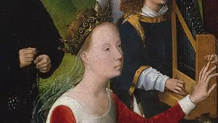 Em 1910, James Weale identificou Santa Catarina de Alexandria como um possível retrato de Maria de Borgonha e Santa Bárbara de Nicomédia muito semelhando com Margarida de Iorque[6], o que o historiador de arte medieval Thomas Kren acha plausível. As duas mulheres pertenceram ao "Guild of St. Barbara" em Gante; Margarida de Iorque foi uma ávida bibliófila que encomendou vários manuscritos, entre eles "Life of St Catherine".[7]