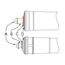 Ilustração da culatra de um canhão com o cascavel e os seus componentes: A = botão, B = pescoço, C = filete, D = base da culatra.