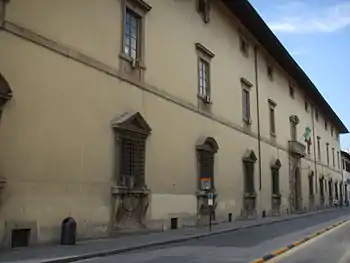 O primeiro palácio neste sítio, uma "casa com pátio e loggia" confinante com o Giardino di San Marco, antigamente de Lourenço o Magnífico, pertencia a Otaviano de Médici, descendente de um ramo secundário da família Médici, mas casado com Francesca Salviati, descendente do ramo principal dos Médici de "Cafaggiuolo" e irmã de Maria Salviati, mãe de Cosme I. Otaviano, que foi pai do Papa Leão XI, havia adquirido a propriedade à Compagnia di Tessitori di Drappi (Companhia dos Tecedores de Panos), que tinha sede na vizinha Loggia dei Tessitori e da qual resta memória na toponímia da vizinha Via degli Arazzieri. Em consequência da contracção duma grande dívida para com o tesouro do Estado, Otaviano foi obrigado a ceder o palácio, o qual foi integrado nos bens do grão-duque Cosme I.