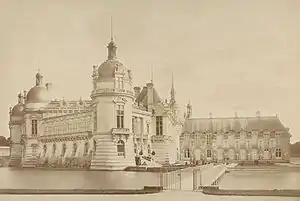 De 1876 a 1882, o Duque de Aumale mandou reconstruir o palácio sobre as suas antigas fundações, segundo os planos do arquitecto Honoré Daumet. Acumulou ali admiráveis colecções. Sem descendentes, legou o magnífico conjunto ao Instituto de França em 1886, o que justifica da seguinte forma no seu testamento: "Querendo conservar à França o domínio de Chantilly na sua integridade, com os seus bosques, […], os seus edifícios e o que eles contêm, troféus, quadros, livros, arquivos, objectos de arte, todo este conjunto que forma como que um monumento completo e variado da arte francesa em todos os seus ramos e da história da minha pátria nas épocas de glória, resolvi confiar o depósito a um corpo ilustre […] que, sem se subtrair às transformações inevitáveis das sociedades, escapa ao espírito de facção, como aos abalos demasiado bruscos, conservando a sua independência no meio das flutuações políticas."