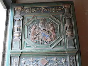 A partir do vestíbulo, uma porta de madeira do século XVI dá acesso à escadaria. As suas camadas esculpidas representam a Velha Lei (sob a figura de uma dama vendada, com um livro e um bastão de peregrino) e a Nova Lei (com uma face descoberta e segurando uma palma e um cálice).