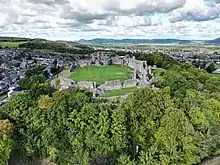 A planta original do castelo consistia num longo vão de pano de muralhas, com meias torres redondas salientes, irregularmente espaçadas, com duas portarias. Estas muralhas originais formam, actualmente, as muralhas da cidade. O actual castelo estava dividido do resto da área envolvente por um novo conjunto de sólidas muralhas ao estilo do Castelo de Caernarfon, incluindo a única portaria com três torres, que é a sua característica mais marcante. Apesar de não existirem fortes evidências para prová-lo, é largamente aceite que o arquiteco responsável por estas muralhas foi o mestre pedreiro do rei, James of Saint George. O castelo também é o local duma aparição da "Dama Cinzenta" (Grey Lady).