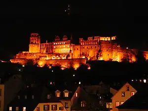 A iluminação produzida pelos fogos de artifício incide sobre o castelo várias vezes por ano, constituindo, também, uma encenação evocativa da destruição do castelo, no ano de 1693. A iluminação do castelo pelos fogos é motivo para os numerosos soldados norte-americanos estacionados em Heidelberg deixarem os seus assentamentos na cidade e comemorarem nos prados que marginam o Neckar. Mark Twain, que assistiu à iluminação em 1878, descreveu o espectáculo da forma que se segue:
