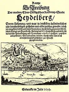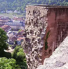Na guerra contra os poderes aliados europeus, o Conselho de Guerra da França decidiu-se pela destruição de todas as fortificações e pela devastação do Palatinado (Brûlez le Palatinat! - "Queimem o Palatinado!"), como forma de prevenir o ataque dos inimigos a partir dessa área. Quando os franceses se retiraram do castelo, no dia 2 de Março de 1689, incendiaram-no e destruíram a fachada da grande torre. Também foram incendiadas partes da cidade, mas a misericórdia dum general francês, René de Froulay de Tessé, que disse aos habitantes para acender pequenos fogos nas suas casas de forma a criar a ilusão de estarem a arder, preveniu maiores destruições.[3]