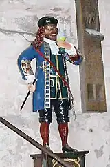 Um brasão com anjos sobre o portal adorna o edifício. Acredita-se que esta é a insígnia do construtor, imortalizada para o mundo desta forma. De acordo com a tradição, os dois anjos sobre o brasão representam os filhos do construtor, os quais, durante a construção do castelo, terão caído dum andaime e morrido. O mestre tornou-se tão melancólico que a construção chegou a um impasse.