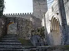 - 'Porta da Albacara (recolha de gado, em árabe), em estilo românico, em cotovelo conforme o uso muçulmano. No embasamento das torres que a defendem, encontram-se algumas lápides com inscrições romanas, oriundas da antiga "civitas" de Colipo, que existiu a perto da Barreira - na verdade grande parte do castelo foi construído com as pedras da civita, não restando nada desta ao não ser as pedras para aqui transladadas.