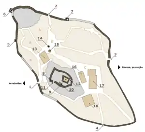 - a cidadela, pólo militar situado na cota mais elevada do terreno, integrada pela torre de menagem, três torres defensivas e que se comunica com a vila por duas portas;